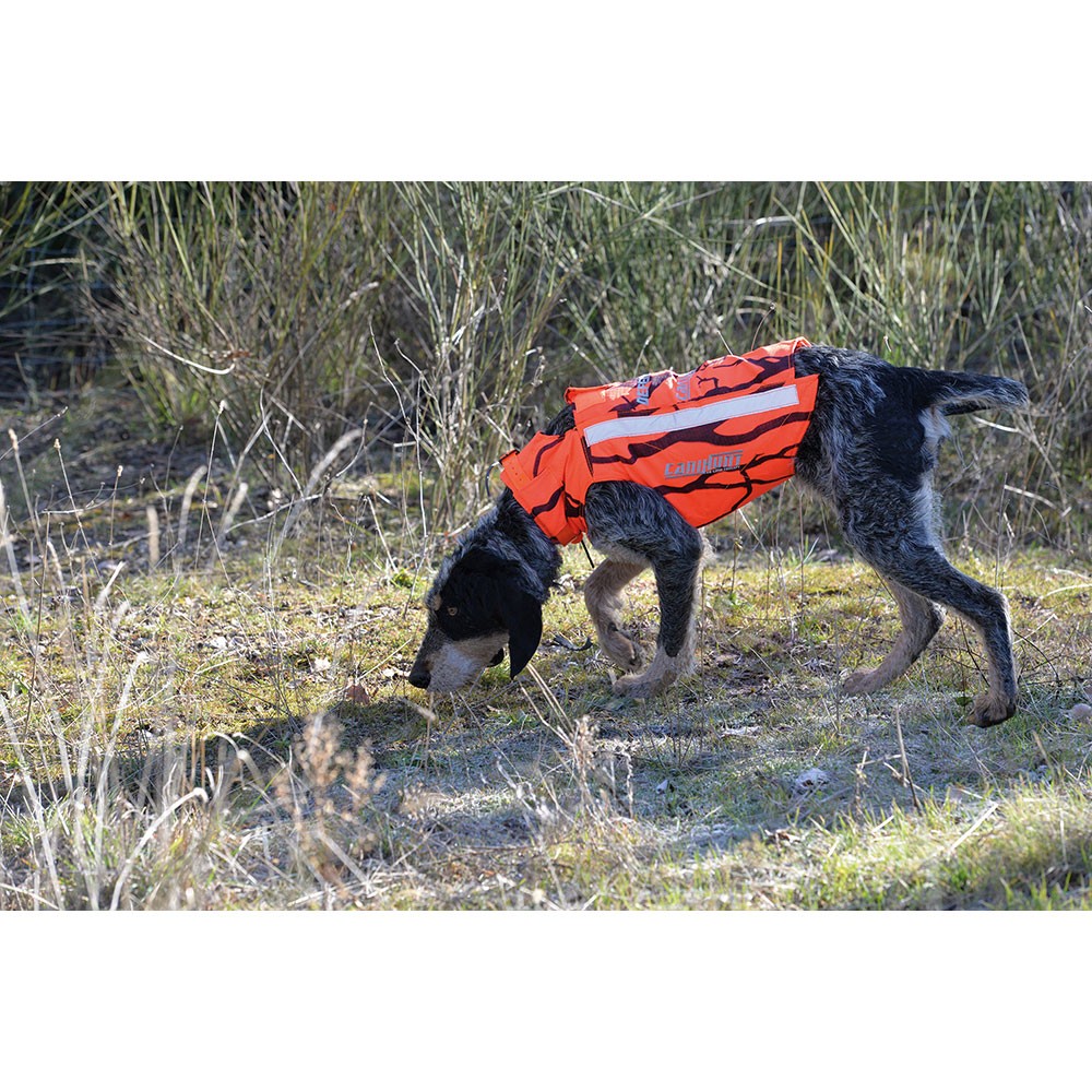 El chaleco CaniHunt DEFENDER 2.0 ofrece protección óptima y confort a su perro gracias a su diseño y acabados técnicos. Además, su patrón de camuflaje naranja neón lo hace inconfundible.