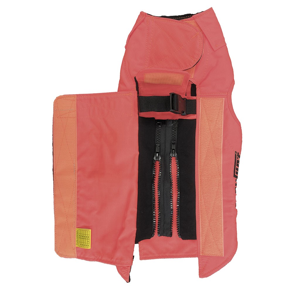 - El sistema de cierre mediante cremalleras permite añadir hasta 4 tiras de cremalleras adicionales (de 2,5 cm de ancho cada una) para ajustar mejor los chalecos a la morfología de los perros. Este chaleco incluye una cremallera adicional.