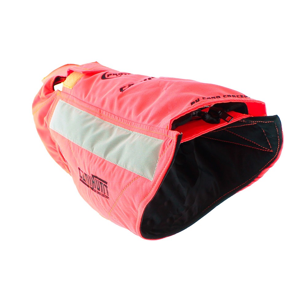 - Tejido CORDURA 600 DTEX con estructura RIPSTOP®. Resistente al desgarro y a los biotopos más duros y abrasivos, a la vez que permite una gran movilidad a los perros gracias a su gran flexibilidad. Esta capa está tratada además con 2 capas de inducción que permiten que el chaleco sea hidrófugo y casi impermeable, a la vez que lo protegen de los rayos UV.