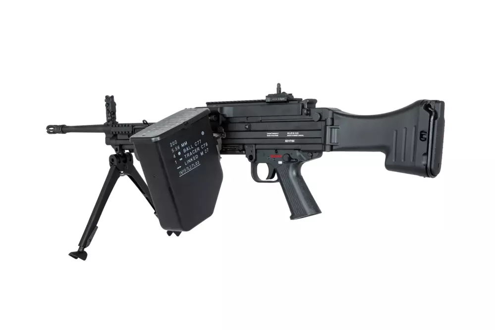 Réplica licenciada bajo el ala de Umarex, conservada en dimensiones 100% 1:1 con la ametralladora MG4 original. Siendo el sucesor de los fusiles MG3, el diseño ha sido adelgazado y modernizado.