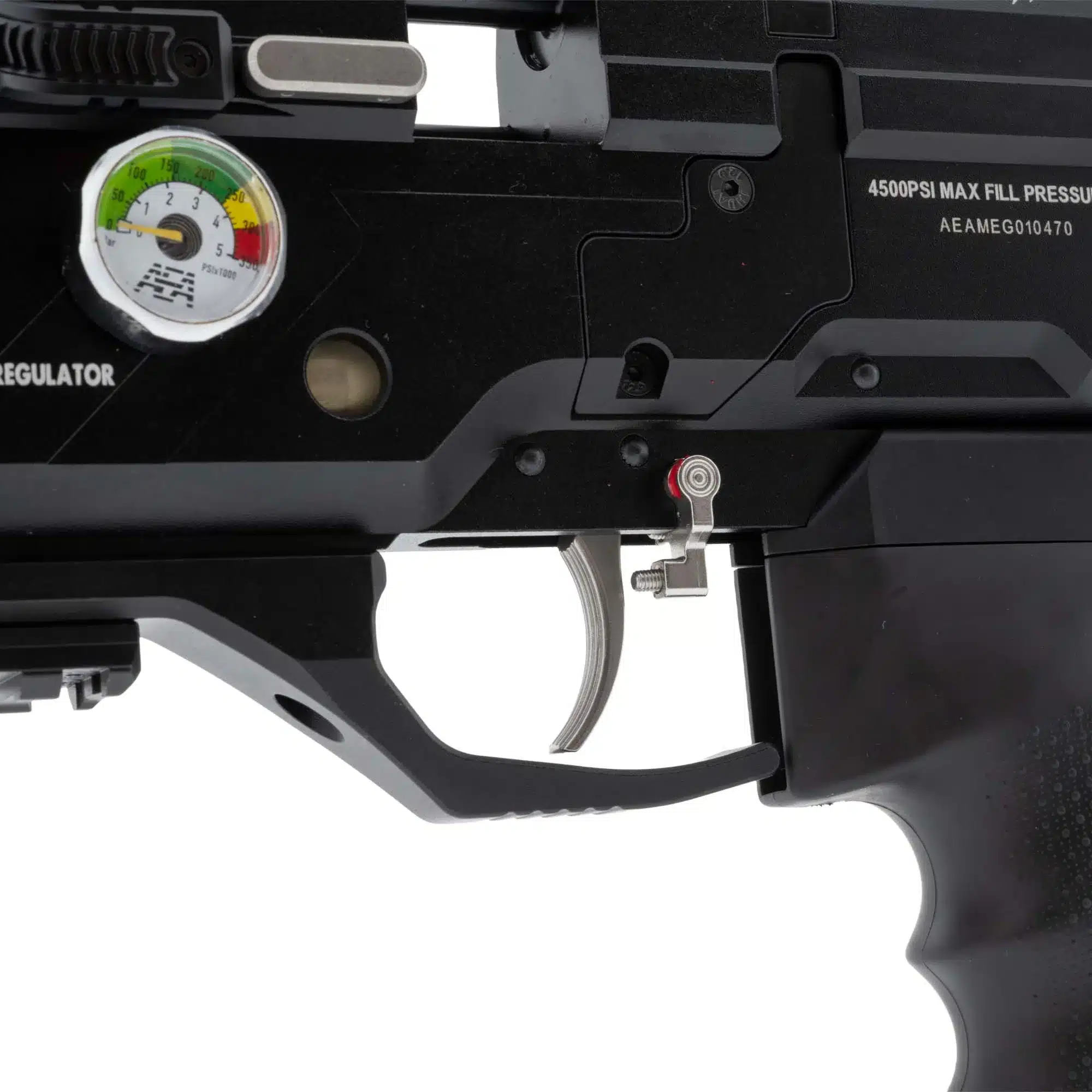 El rifle cuenta con un riel Picatinny de 22 mm para el montaje de ópticas y accesorios. El sistema PCP se llena mediante una boquilla estándar con botellas de buceo, compresores o bombas manuales. El gatillo de acción simple proporciona un punto de quiebre predecible. Disponible en configuración para diestros con acción de tiro directo .