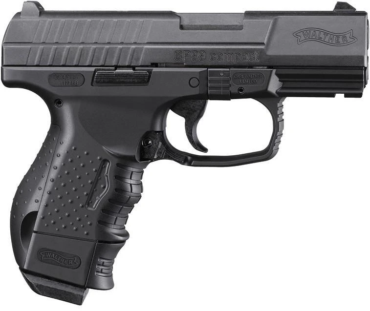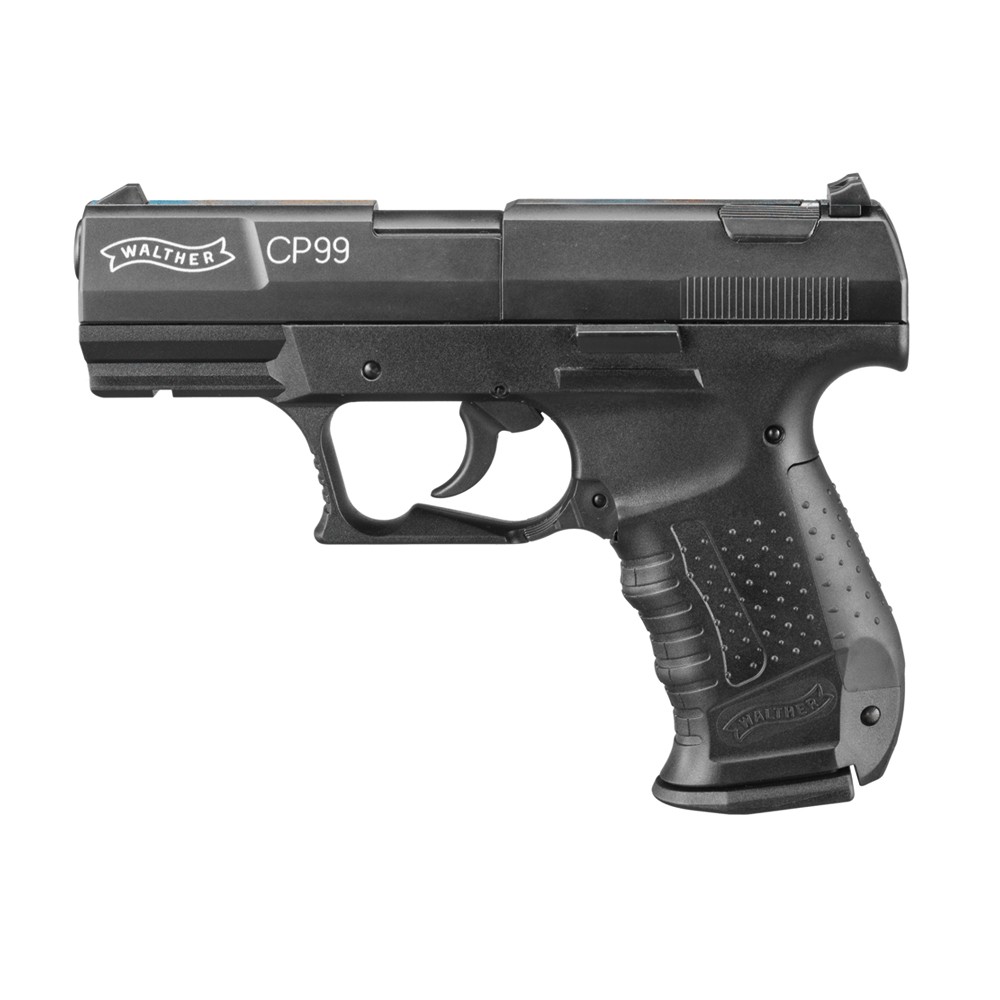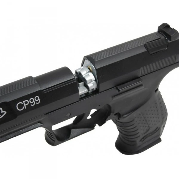 Esta Walther CP99 replica a la conocidísima Walther P99. La P99 fue diseñada en Alemania para fuerzas policiales, agencias de seguridad y el mercado civil del tiro al blanco. El diseño de esta C99 es muy parecido como podemos ver en su empuñadura y las miras de combate. Estamos ante una réplica de CO2 que utiliza bombonas de 12 gramos. Se alimenta por un cargador rotatorio con capacidad para 8 disparos del 4.5mm.