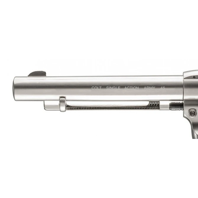 El revólver Colt SA Army 45 Niquel es un arma semi-automática que tiene un cañón de acero estriado de 5,5″ y una corredera fija. Tiene una capacidad en el cargador de 6 balines e incluye un gatillo de simple acción. En cuanto a la óptica, incorpora miras fijas