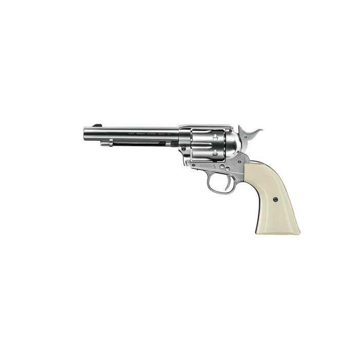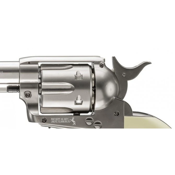 El fabricante americano Colt ha diseñado un revólver semi-automático basado en la réplica del Colt Peacemaker, el arma más famosa del Viejo Oeste. Tiene un acabado en nickel, que es un acabado en tono plateado, el cual le proporciona una belleza diferencial a este revólver.