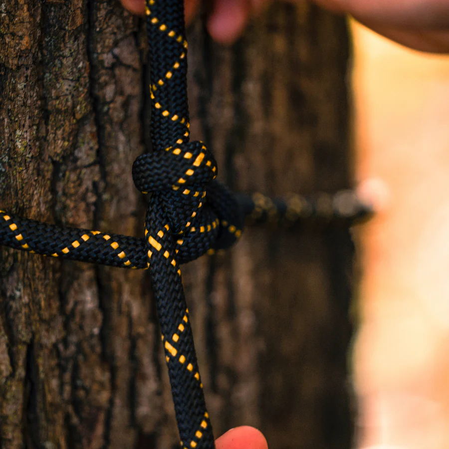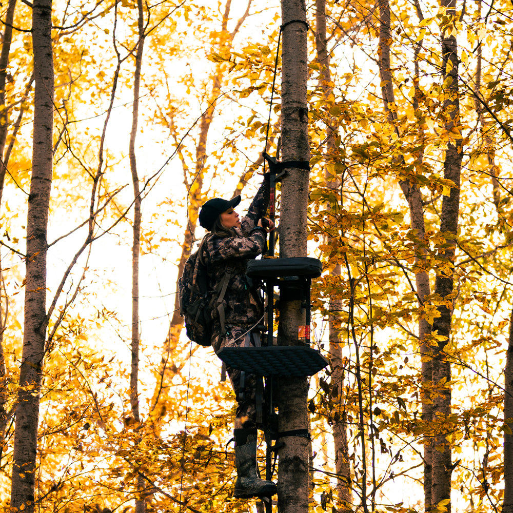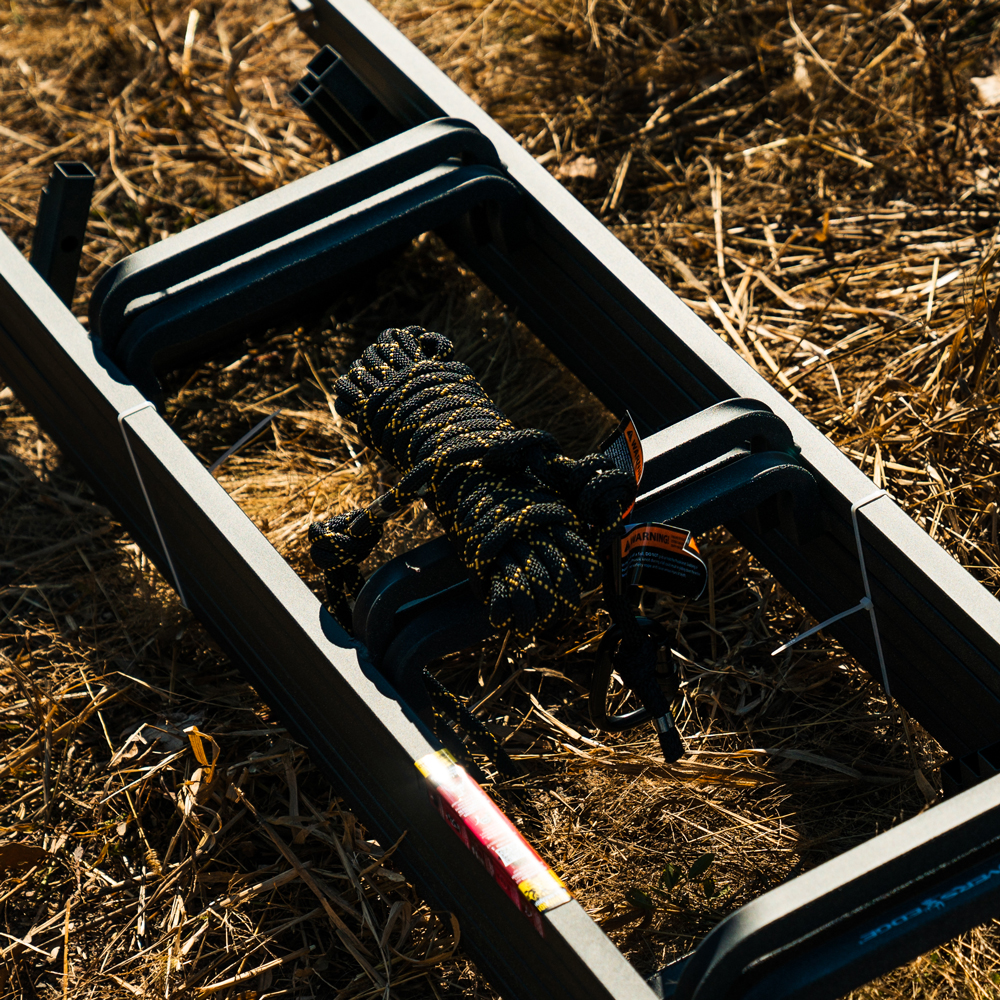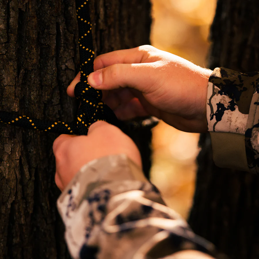 La línea de vida Safety Rope de 30′ (9,1m) permite al usuario mantenerse conectado al árbol en todo momento. El nudo Prusik se desliza fácilmente hacia arriba y hacia abajo por la cuerda durante el ascenso y el descenso pero se bloquea inmediatamente en caso de que ocurra una caída. Enganchado a ella el cazador estará a salvo desde el momento en que deja el suelo y hasta el momento en que vuelva a pisarlo.