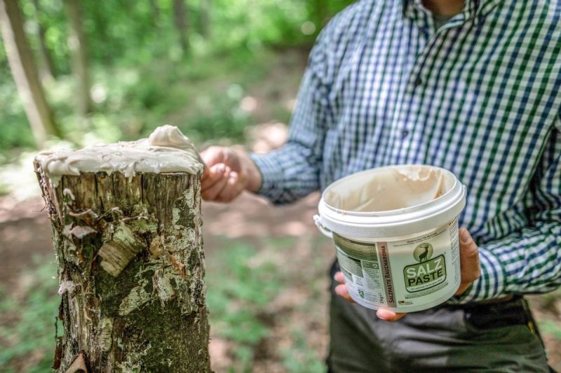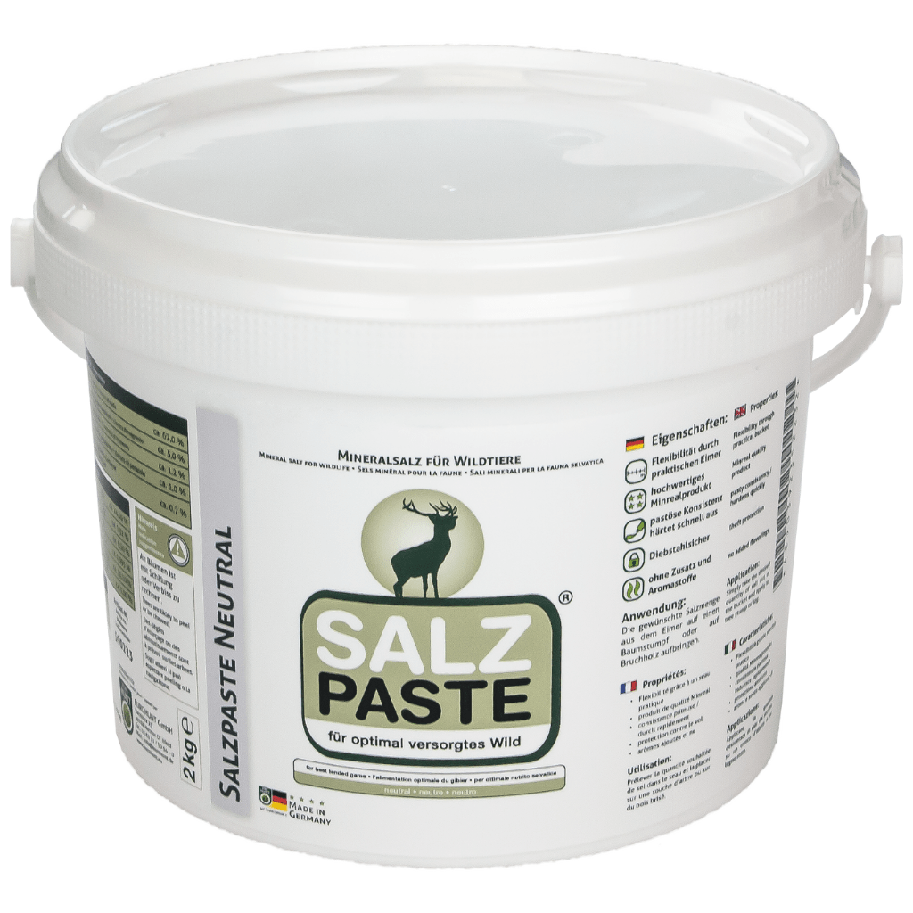 Nuestra pasta de sal es un producto mineral de alta calidad con una consistencia pastosa. Debido a la aplicación flexible, es posible suministrar de manerasencilla las sales minerales necesarias en cualquier punto deseado de la zona. Gracias al práctico envase, puedes llevar contigo la pasta de sal sin ensuciar el vehículo ni a ti mismo . Simplemente esparce la cantidad deseada de sal en un tocón de árbol o madera rota y deja que se endurezca. La ventaja adicional de Waidmann: no se puede robar pasta de sal.