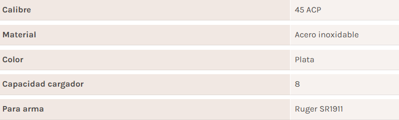 Cargador del calibre 45 ACP de acero inoxidable con capacidad para 8 balas, con logotipo Ruger y placa de base de plástico extraíble. Valido para pistolas Ruger SR1911. Accesorio de fábrica original Ruger.