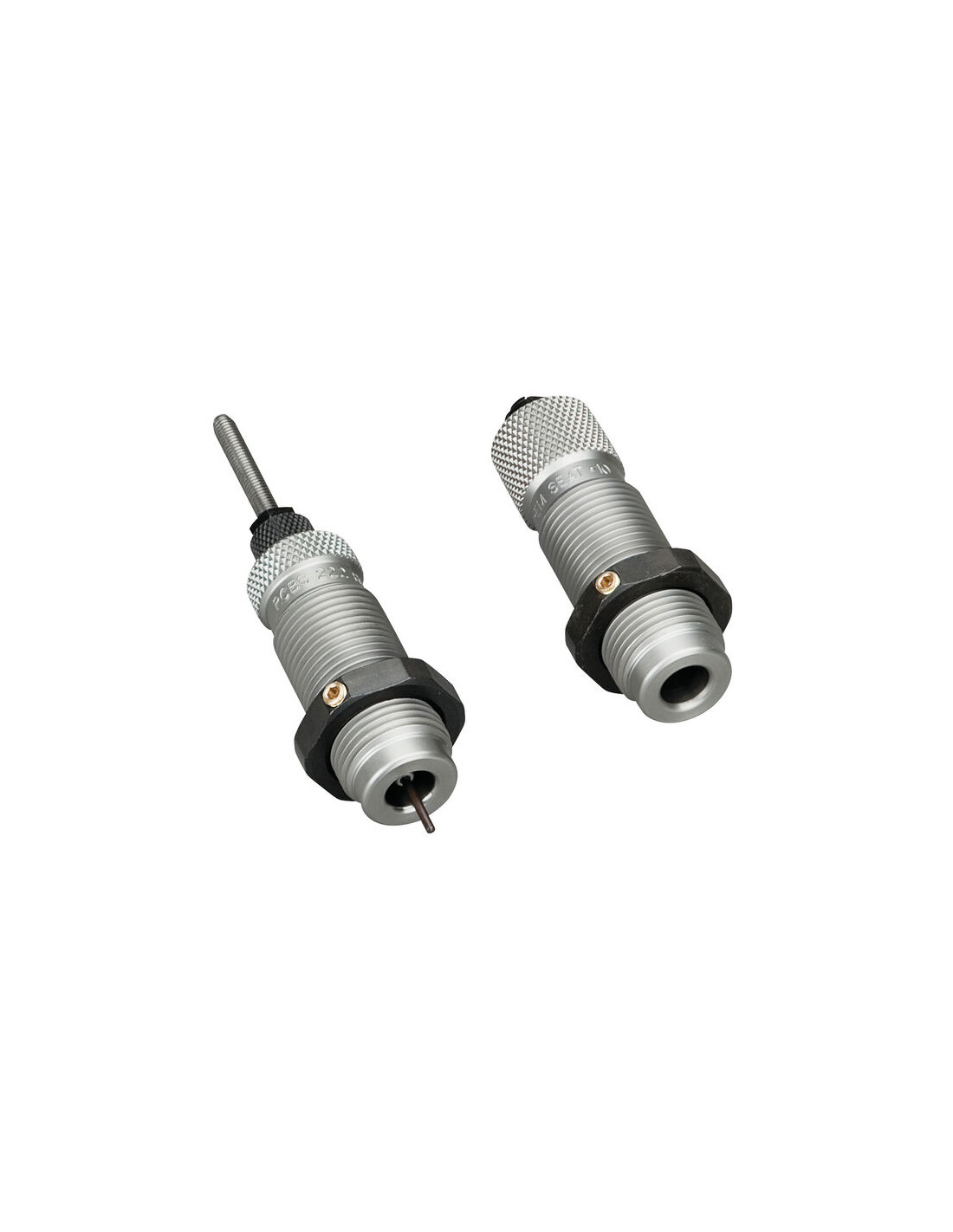 Este juego de 2 Dies está diseñado para recargar cartuchos de cuello de botella que se dispararán solo en rifles de cerrojo. Consta de un troquel de tamaño de cuello con una unidad de expansión y desempistonado y un troquel de asiento con tapón de asiento de bala. Este Die cambia el tamaño del cuello solamente,