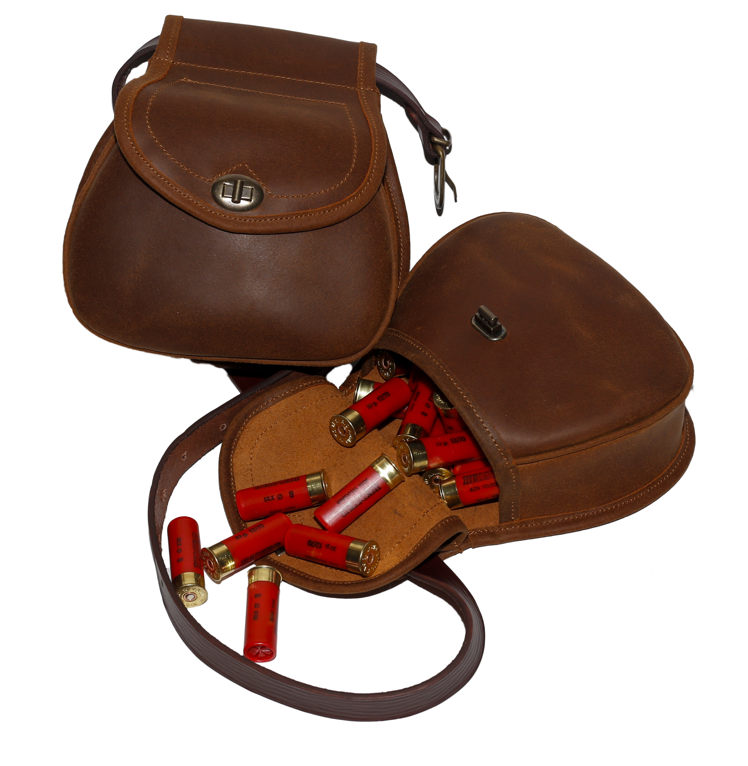 Pareja de bolsas de ojeo delux en cuero engrasado con cinturón, capacidad para 50 cartuchos por bolsa.