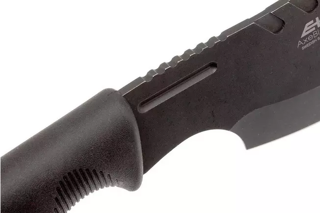 La hoja del AxeBlade está hecha de acero Sandvik 12C27. Un tipo de acero sueco desarrollado específicamente para cuchillos. Conserva bien su afilado y es resistente a la corrosión. Para proteger la hoja, se ha incorporado un revestimiento de color negro. Por ello, las huellas de uso son apenas invisibles.