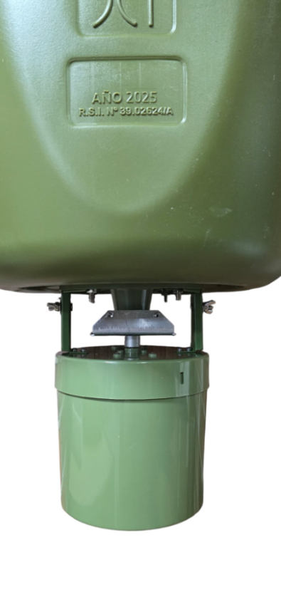 Comedero automático 12v con bidón de 60L y asa Programable hasta 4 tiradas diarias de 5 kg, autonomía de 6 meses con batería de 6 v. Bidón resistente, camuflado y fácil de rellenar, ideal para cebaderos y uso en el campo.