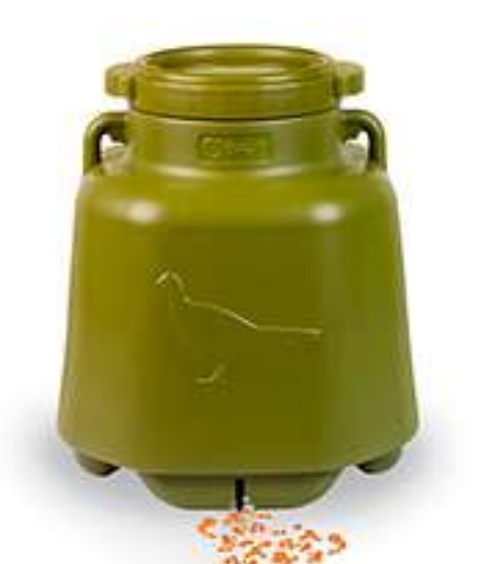 - Comedero dispensador de campo con una capacidad de 40 litros para perdices, fabricado en plástico pulido y tapa desmontable a rosca, permitiendo hermeticidad y manteniendo fresco y limpio el pienso, con aberturas en su base para ir extrayendo el alimento.