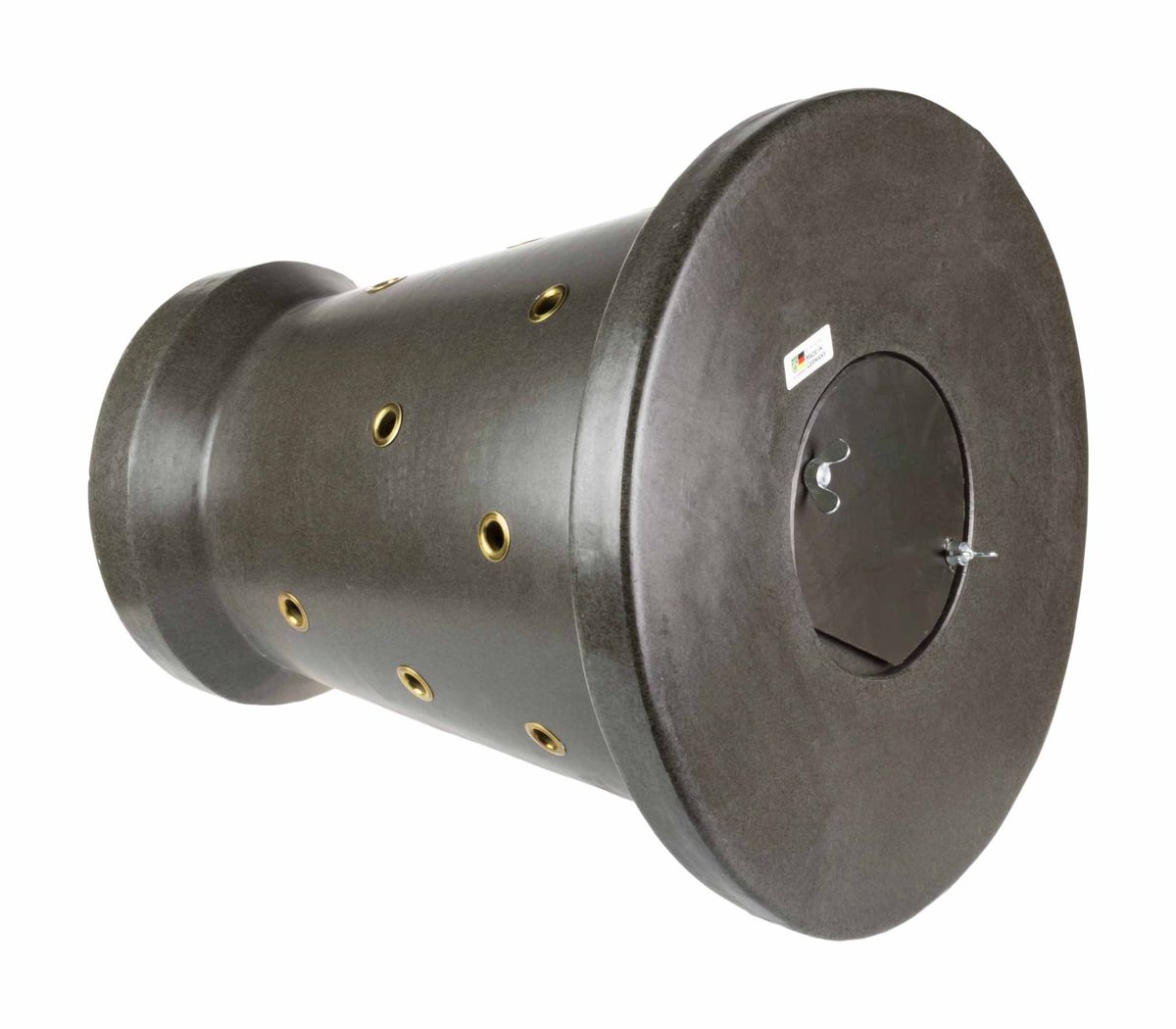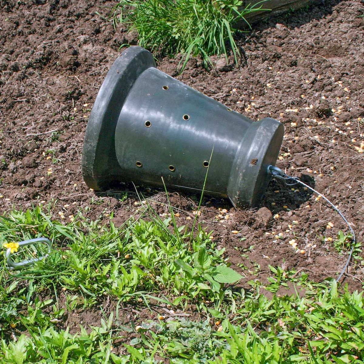 Barril de empuje cónico con piqueta de acero y cable acerado resistente. Capacidad para aproximadamente 18 kg para cualquier tipo de cereal como el maíz, perfecto para los comederos de jabalíes y otras reses.