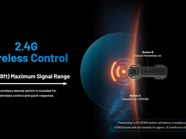 La MH40 PRO es muy fácil de usar. Para cambiar entre los modos principales, el SOS, el modo baliza y la función estroboscópica, basta con pulsar el botón situado en el lateral de la linterna (cerca del foco). Utiliza el interruptor táctico de la parte posterior para elegir entre luz temporal o constante. El mando a distancia táctico incluido ofrece comodidad adicional y viene con accesorios de montaje. Esto te permite fijar fácilmente el mando a distancia al objeto que quieras, como un trípode u otra herramienta táctica. El mando a distancia está equipado con una pila de botón CR1632 de 3 V no recargable, que tiene una duración aproximada de 4000 accionamientos.