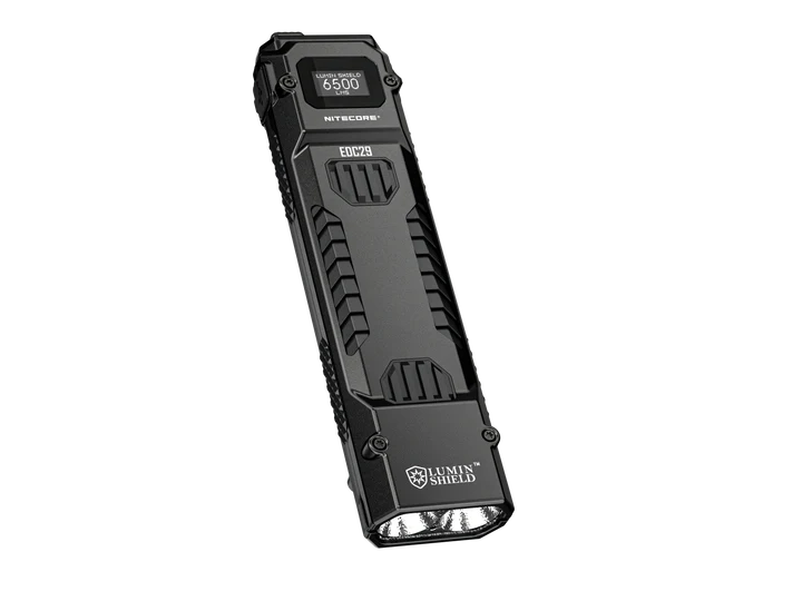 Linterna de Bolsillo Ultraplana EDC29 con una potencia impresionante de 6.500 lúmenes y alcance de 400 metros. Equipado con batería recargable de 2.500 mAh y pantalla OLED multifuncional, ideal para actividades al aire libre y uso táctico. Resistente al agua, al polvo (IP54) y a impactos de hasta 1 metro.