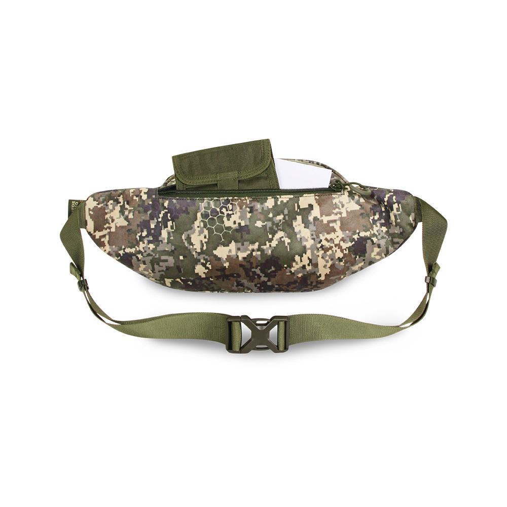 Fabricada en tejido Suede silencioso y resistente. Cuenta con dos bolsillos frontales y dos compartimentos laterales. Correa de cintura ajustable.