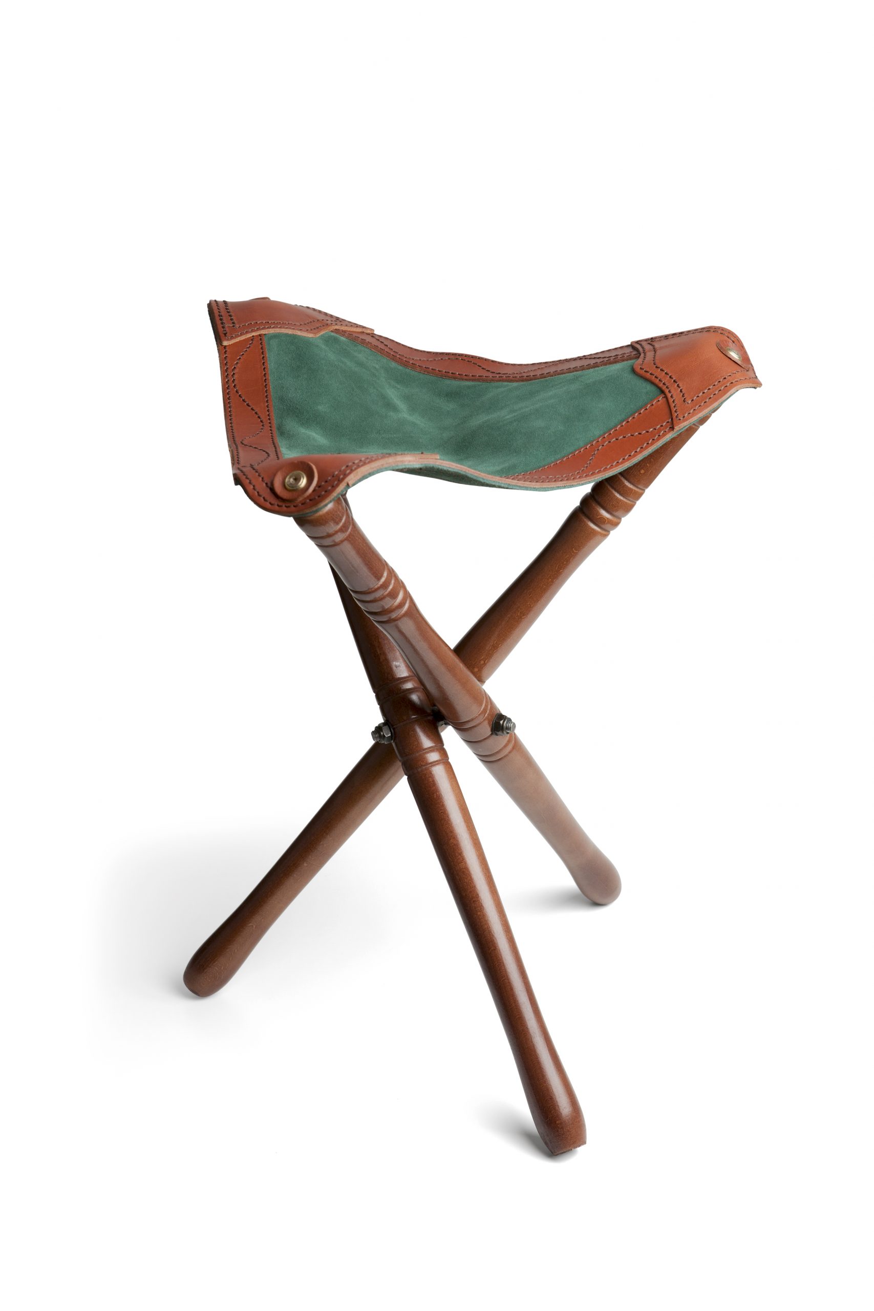 Banquillo en cuero afelpado verde de gran calidad, con refuerzos en piel vaquetilla coñac de máxima calidad, patas de madera de haya de gran resistencia y correa para transporte.