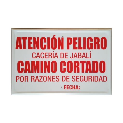 Tablilla Atención Peligro cacería de jabalí camino cortado por razones de seguridad (C. Valenciana) 50×33