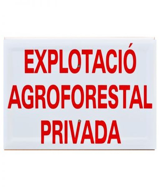Tablilla Explotació Agroforestal Privada utilizada para la advertencia en zonas catalano-parlantes con medidas 30×20.