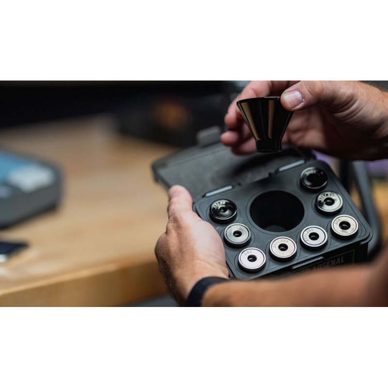 El kit de embudo de aluminio para polvora Frankford Arsenal le ayuda a llenar fácilmente vainas de calibre .17 y con mas precisión al eliminar prácticamente las incidencias de polvora del derramado y la adherencia estática. Cada boquilla está grabada con láser por calibre para una fácil identificación y cuenta con una junta tórica para un sellado hermético. Una elegante superficie negra antiadherente mantiene la pólvora libre de estática y elimina las ocurrencias de pólvora derramada para un banco de trabajo limpio y seguro y cargas uniforme