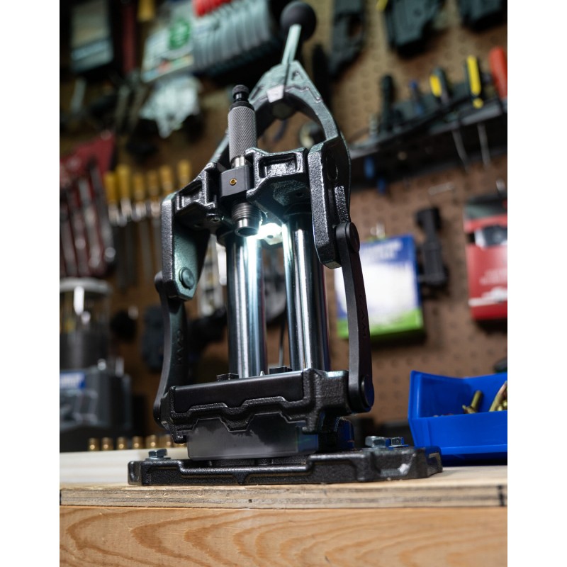 La prensa de recarga de una estacion Frankford Arsenal® fue diseñada para que el recargador serio consiga la munición más precisa posible. Diseñamos una prensa de recarga con un sistema de shell holder universal fácil de ajustar. En combinación con el sistema de shell holder universal fácil de ajustar, le permite cambiar pequeños calibres de pistola a los calibres magnum mas grandes de rifle con solo girar un dial.