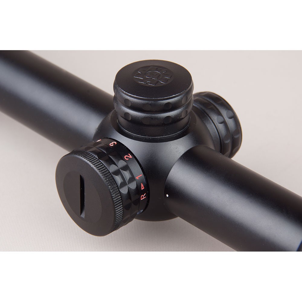 Retícula iluminada: Punto central iluminado. 5 intensidades en azul y rojo