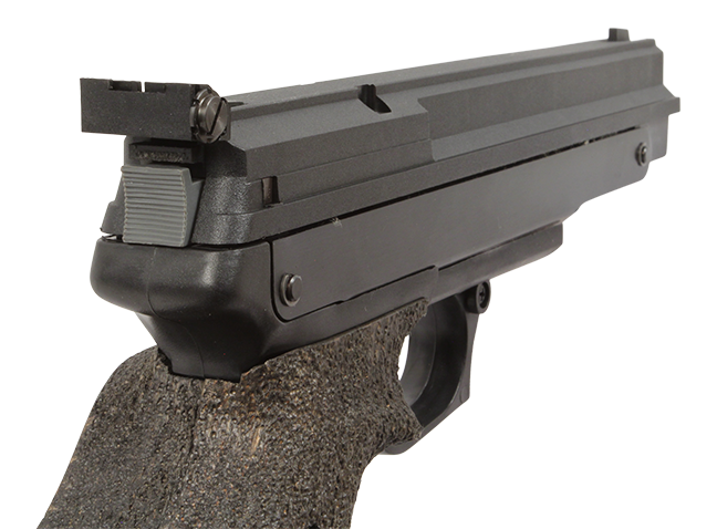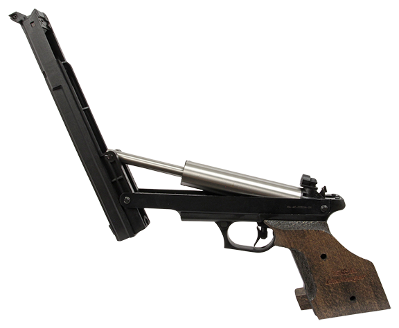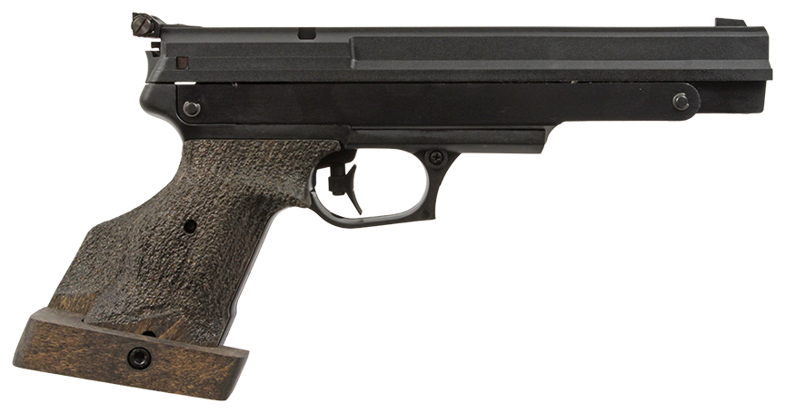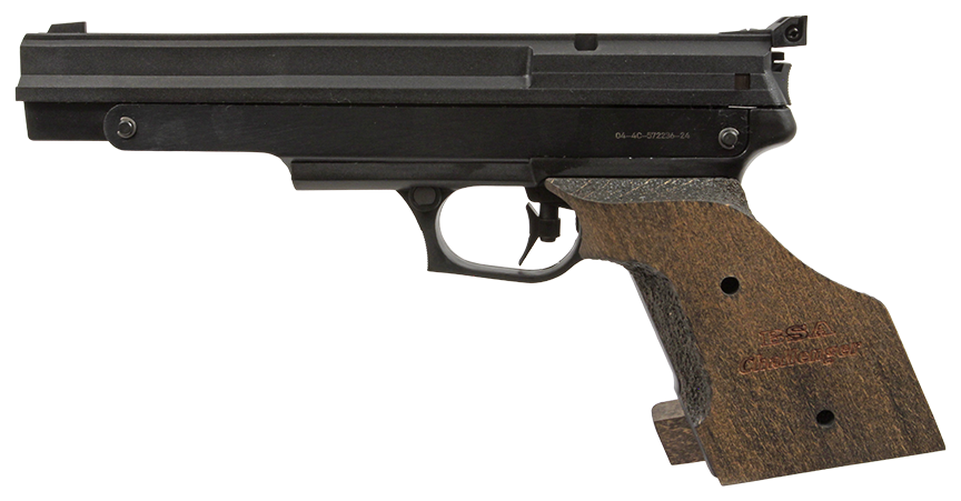 Pistola de aire comprimido BSA Challenger en calibre 4.5mm. Pistola de carga neumática con una velocidad de salida realista que oscila entre 350 y 360 FPS. Su empuñadura de madera está mecanizada con un acabado texturizado para facilitar el agarre.