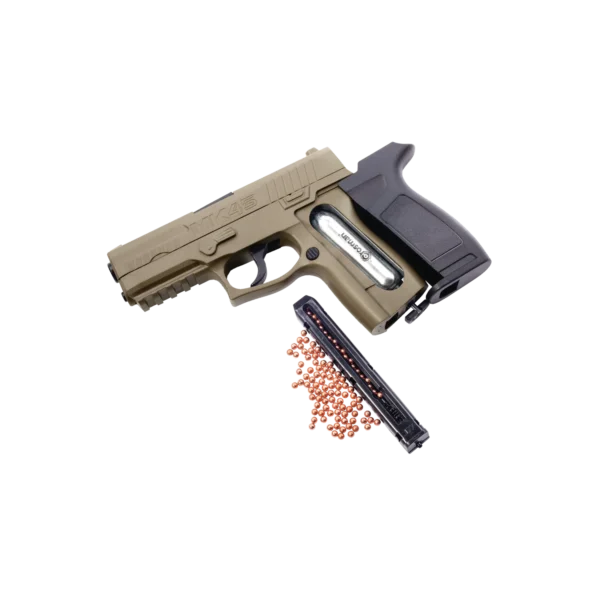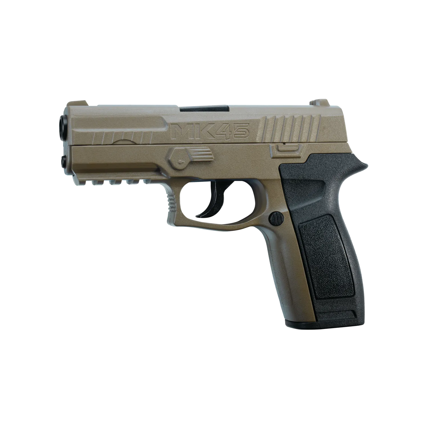 Pistola semiautomática de aire comprimido Crosman MK45 en calibre 4.5mm. Este modelo de la firma americana se alimenta con cápsulas de CO2 de 12 gramos y su cargador es capaz de almacenar hasta 20 bolas de acero (BBs).
