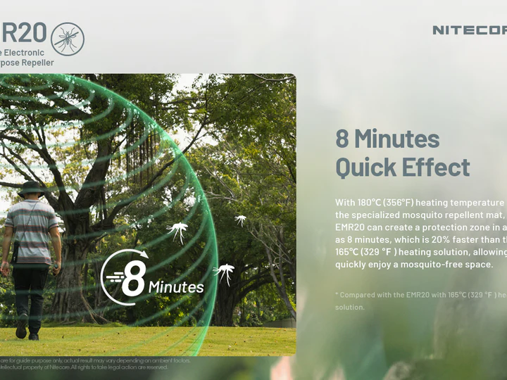 El Nitecore EMR20 es un repelente de mosquitos portátil de Nitecore. Fija el repelente de mosquitos a tu mochila o colócalo a tu lado para acampar. Repele todos los mosquitos y otros insectos molestos en 10 minutos. Cuando el Nitecore EMR20 se calienta, las alfombrillas azules desprenden un olor que no resulta desagradable para los insectos y mosquitos.
