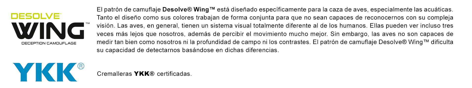 Conjunto de camuflaje DESOLVE® Wing fabricado con tejido ligero, transpirable y con tratamiento hidrofugado. Diseñado con corte Regular Fit, este conjunto, especialmente diseñado para la caza, también cuenta con cintura y mangas elásticas, cremalleras YKK, capucha fija y un total de 5 bolsillos para diferentes funcionalidades.