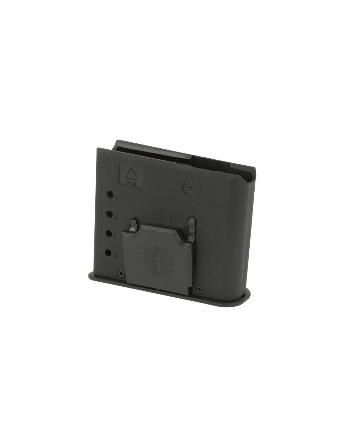 Cargador de 10 balas para los modelos Steyr Pro Hunter, Classic, CLII y SM12 en calibres .25-06 Rem., .270 Win., 30-06, 6.5×55, 7×64 y 8×57 IS. Fabricado con un polímero resistente de color negro mate, con una placa base sintética y un resorte de acero inoxidable, el cargador ofrece una alimentación compacta de doble hilera.