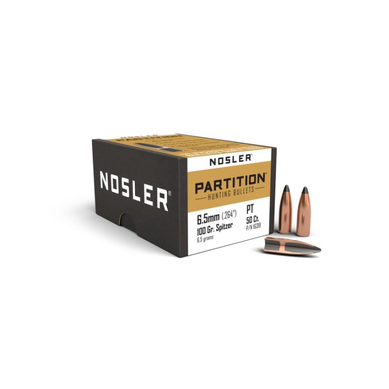 Las balas Nosler Partition de calibre 6.5mm y 100 grains han sido el estándar de referencia para cazadores desde 1948. Diseñadas con una camisa de aleación de cobre totalmente cónica, se rompen instantáneamente al impactar, curvando la camisa uniformemente hacia afuera. El diseño de doble núcleo asegura una expansión rápida del núcleo frontal, mientras que la partición integral de Nosler soporta el hongo expandido, permitiendo que el núcleo trasero permanezca intacto, reteniendo más de dos tercios del peso original de la bala para una penetración profunda.