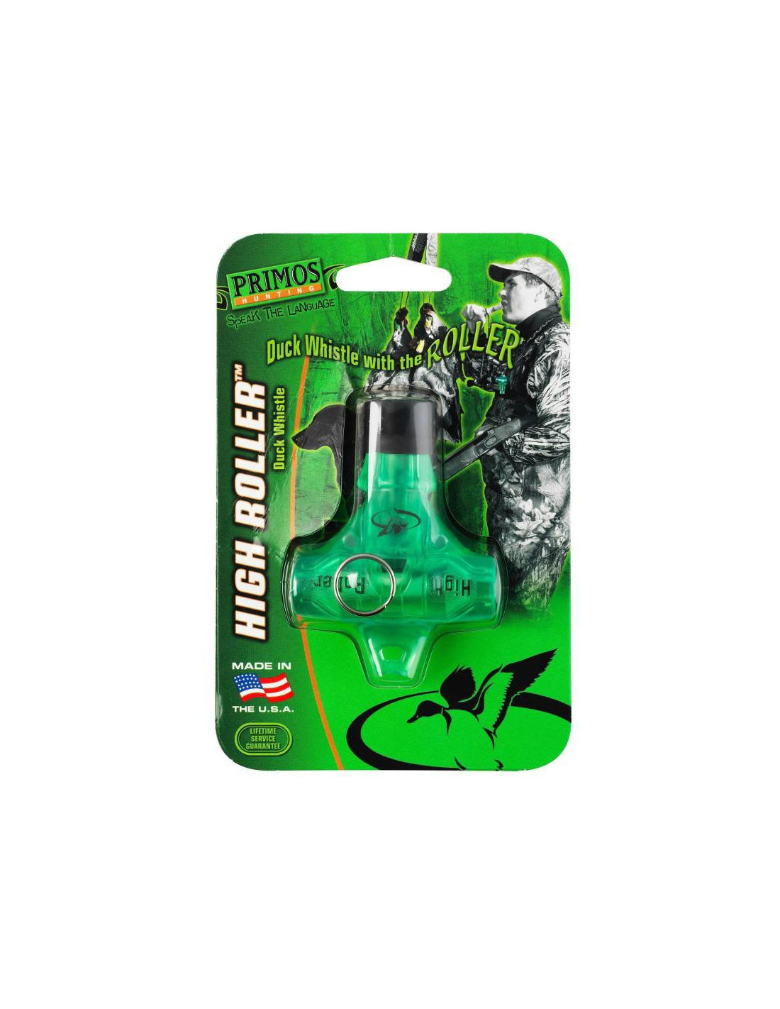 El reclamo para patos High Roller emite sonidos sutiles para diferentes especias acuáticas. El rodillo integrado del High Roller hace que el silbido se agite automáticamente como el graznido de los patos. Se usa para alterar el rumbo de los patos, aparentando ser el pato de cabeza o cola del bando.