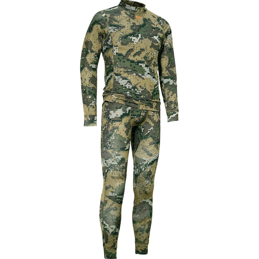 Conjunto de ropa técnica en camo Desolve® VEIL para llevar como primera capa. Fabricada en material ligero, de alta transpirabilidad y antialérgico. Esta prenda queda totalmente ceñida al cuerpo para mantener el calor, aportando un comodidad máxima. La parte superior contiene el cuello redondo y la zona del pantalón cuenta con la zona lumbar algo más elevada para cubrir bien toda la zona.