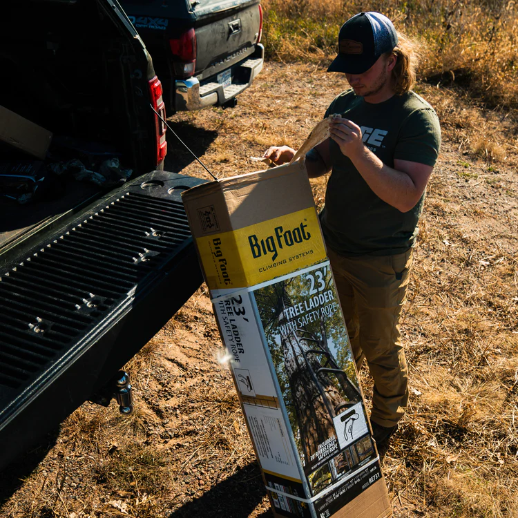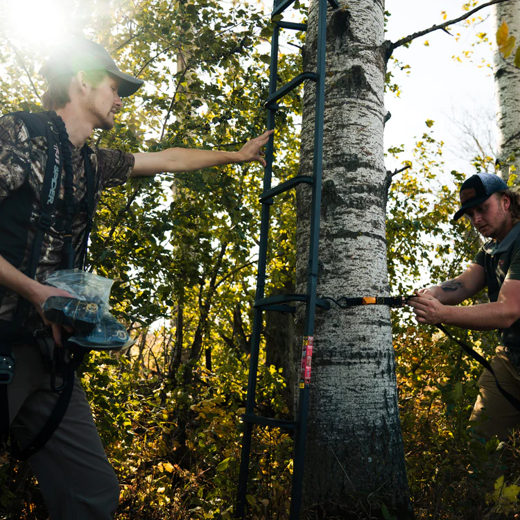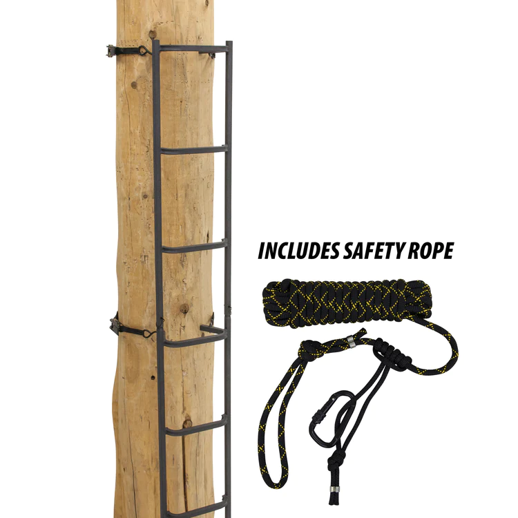 La escalera Big Footb Tree Ladder ha sido diseñada para trepar con confianza. La escalera es lo suficientemente ancha para poner los dos pies en cada escalón e incluye pasamanos en ambos lados para mayor seguridad. Además los peldaños de la escalera están cubiertos con un revestimiento antideslizante permanente Tractioniteb » para un agarre superior. La escalera incluye una cuerda de seguridad o línea de vida y correas con carraca para garantizar una seguridad y estabilidad inigualables.»