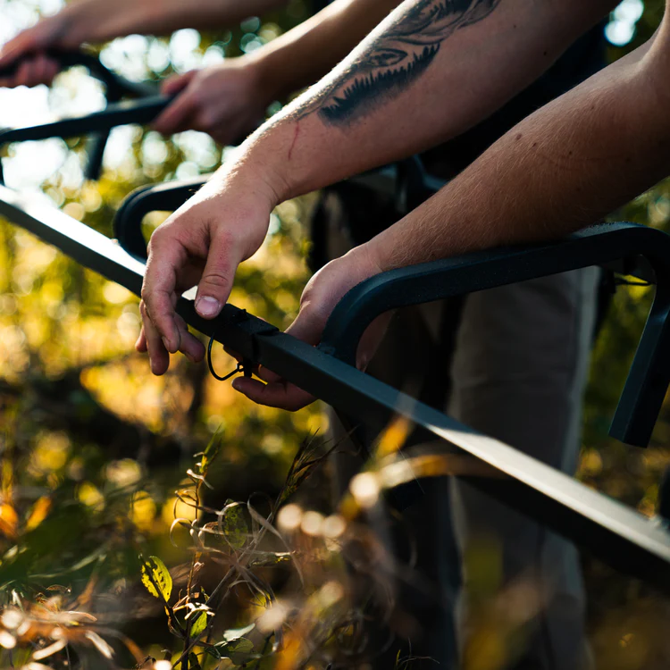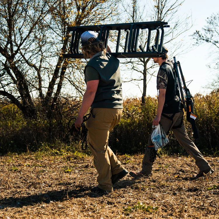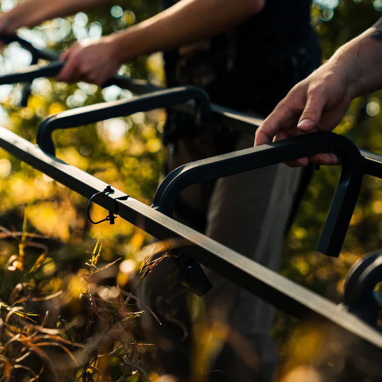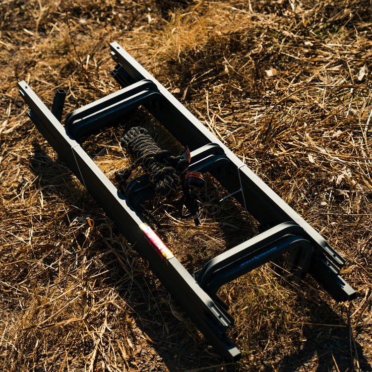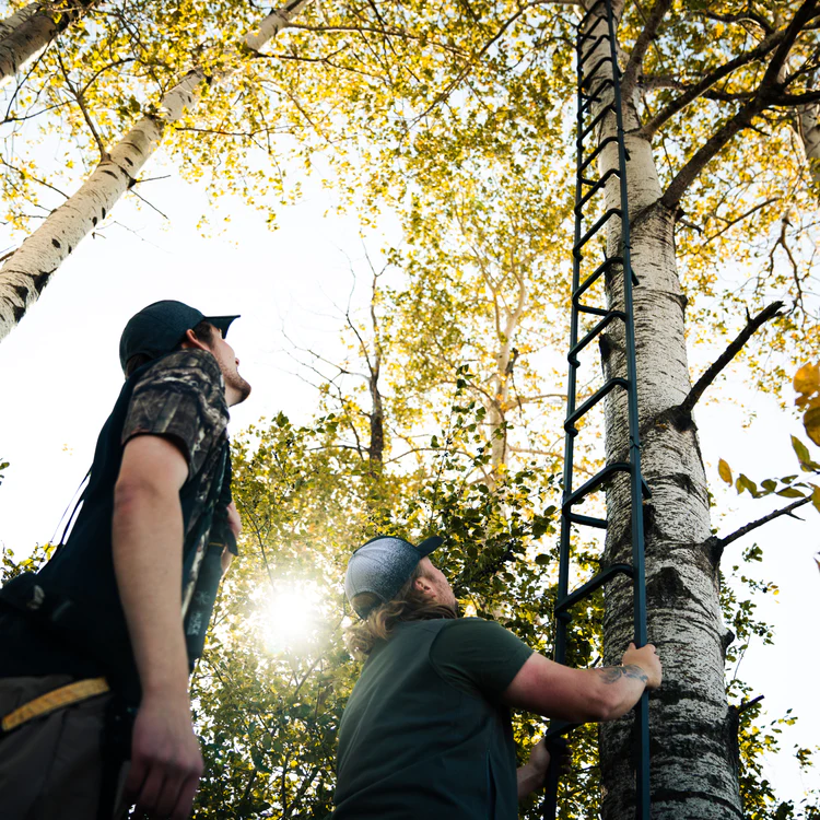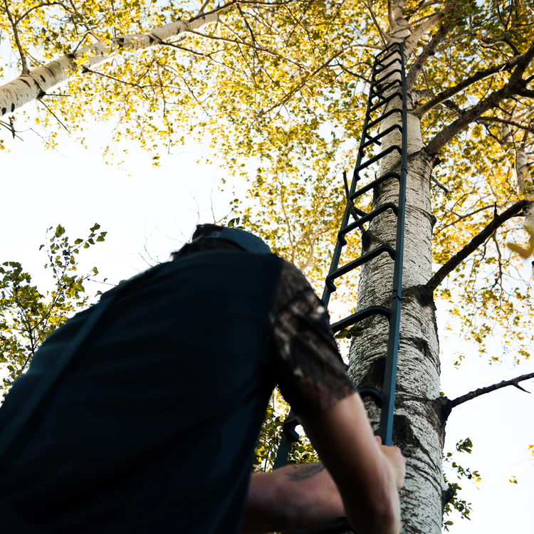 - Su altura total permite colocar un treestand a 20′ (6 m) y que los últimos escalones sobrepasen la plataforma en 3′ (0,9 m) más permitiendo un acceso fácil a la plataforma.