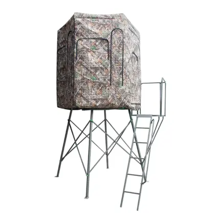Su tablero, elaborado con material hidrófugo y tratado con dos capas de impermeabilización, garantiza una durabilidad excepcional y resistencia ante diversos climas. Esta caseta está diseñada para acomodar a dos personas sentadas, ofreciendo confort y seguridad. Además, su marco de acero robusto aporta la resistencia necesaria para largas horas de espera.